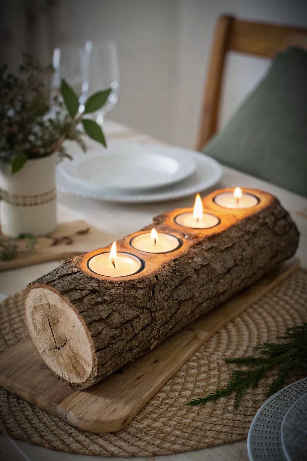 Die präzise eingearbeiteten Vertiefungen bieten einen sicheren Halt für die Teelichter und sorgen dafür, dass das warme Kerzenlicht besonders harmonisch zur Geltung kommt. Ob als Tischdekoration, Akzentstück auf dem Sideboard oder als natürliche Ergänzung zu einem festlichen Essbereich – der Baumstamm-Teelichthalter schafft ein angenehmes, beruhigendes Ambiente.