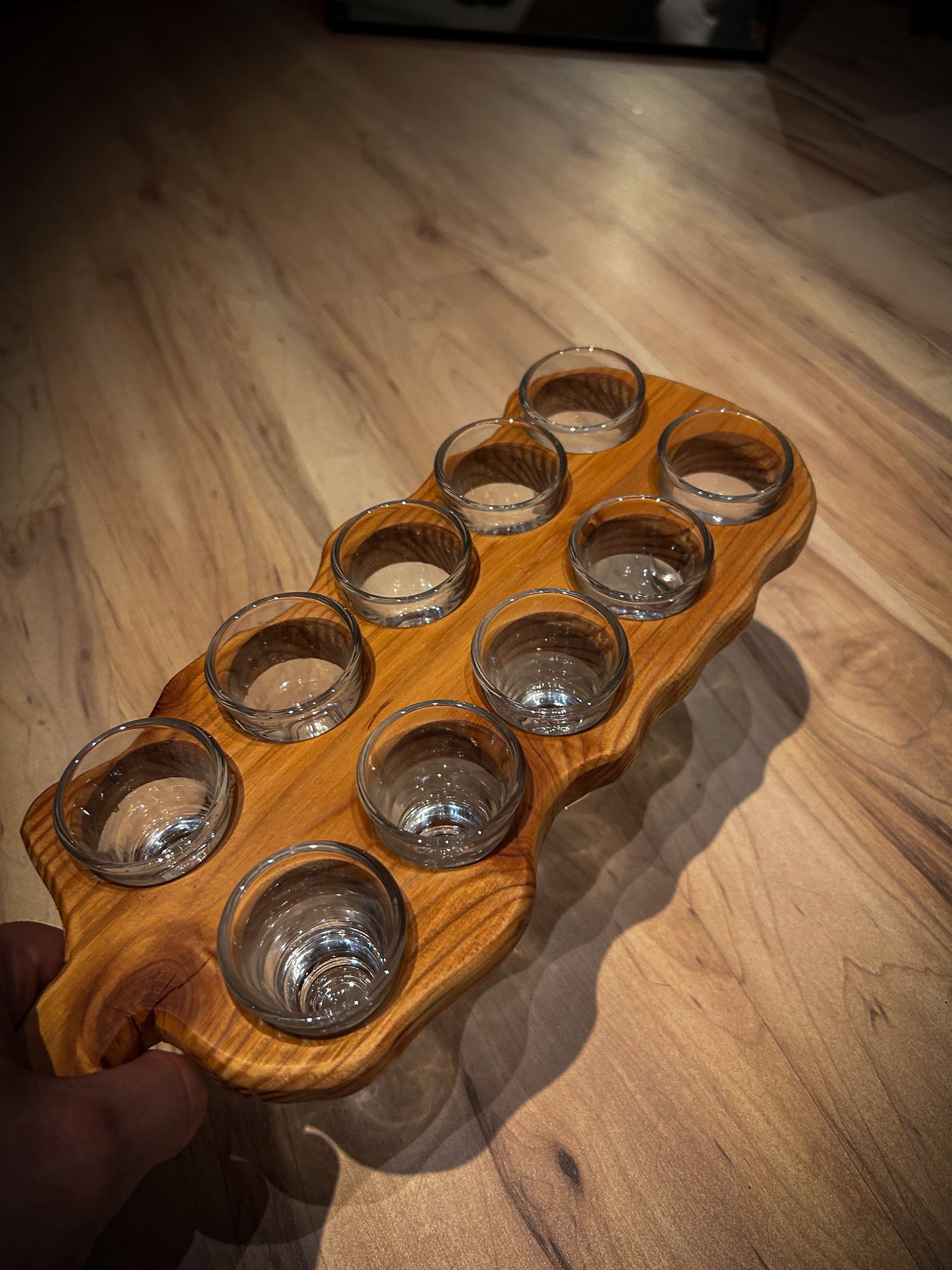 Die kompakte Form, die ruhige Haptik des Lärchenholzes und die präzise eingelassenen Gläser machen das Servieren zuverlässig und effizient. So unterstützt der Halter nicht nur den Transport, sondern verbessert den gesamten Ablauf rund um das Ausschenken und Verteilen.